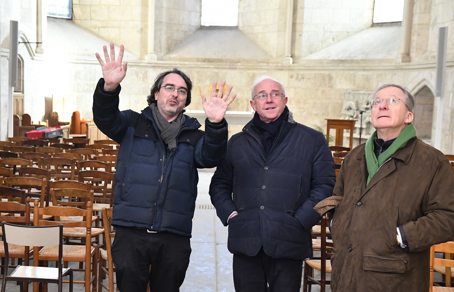 Brice Piechaczyk fait visiter à Bruno Kellet et Jérôme Tolot (ancien et l’actuel directeur général des Chantiers du Cardinal) le Grand projet de Notre-Dame-de-l’Ouye conçu et réalisé par l’agence Enia.
