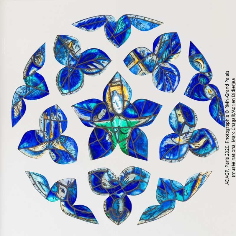 Marc Chagall (en collaboration avec Charles Marq) La rose bleue, œuvre exécutée par l’atelier Simon-Marq, Reims, vitrail d’étude pour la rosace du déambulatoire de la cathédrale de Metz, daté et signé en 1964. Centre national des arts plastiques/Fonds national d’art contemporain. En dépôt au musée national Marc Chagall, Nice © Adagp, Paris 2020. Photographie © RMN-Grand Palais (musée national Marc Chagall)/Adrien Didierjea