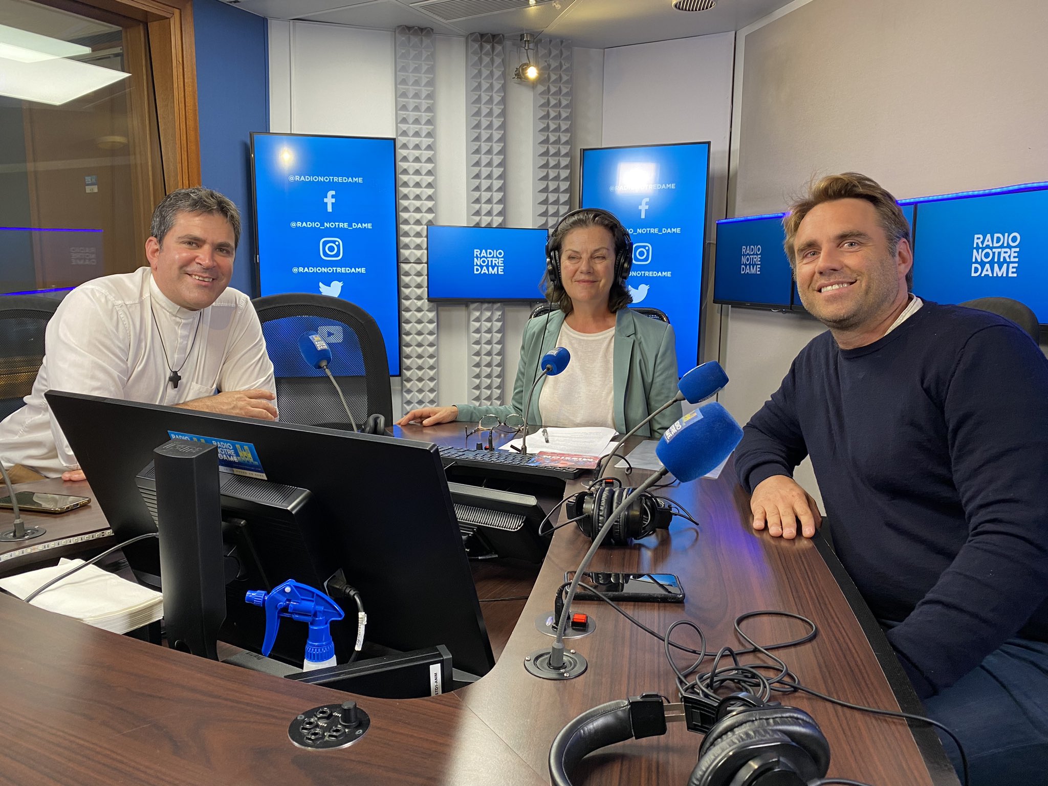 Emission Philantropia présentée par Geneviève del Marmol, avec le père Arnaud Bonnassies (à g.) et Antoine de Tilly (à d.)