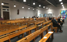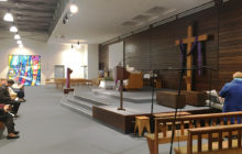 Vue de l’autel. Deux écrans ont été disposés de chaque côté pour projeter les paroles des chants. (Photo François Farez)