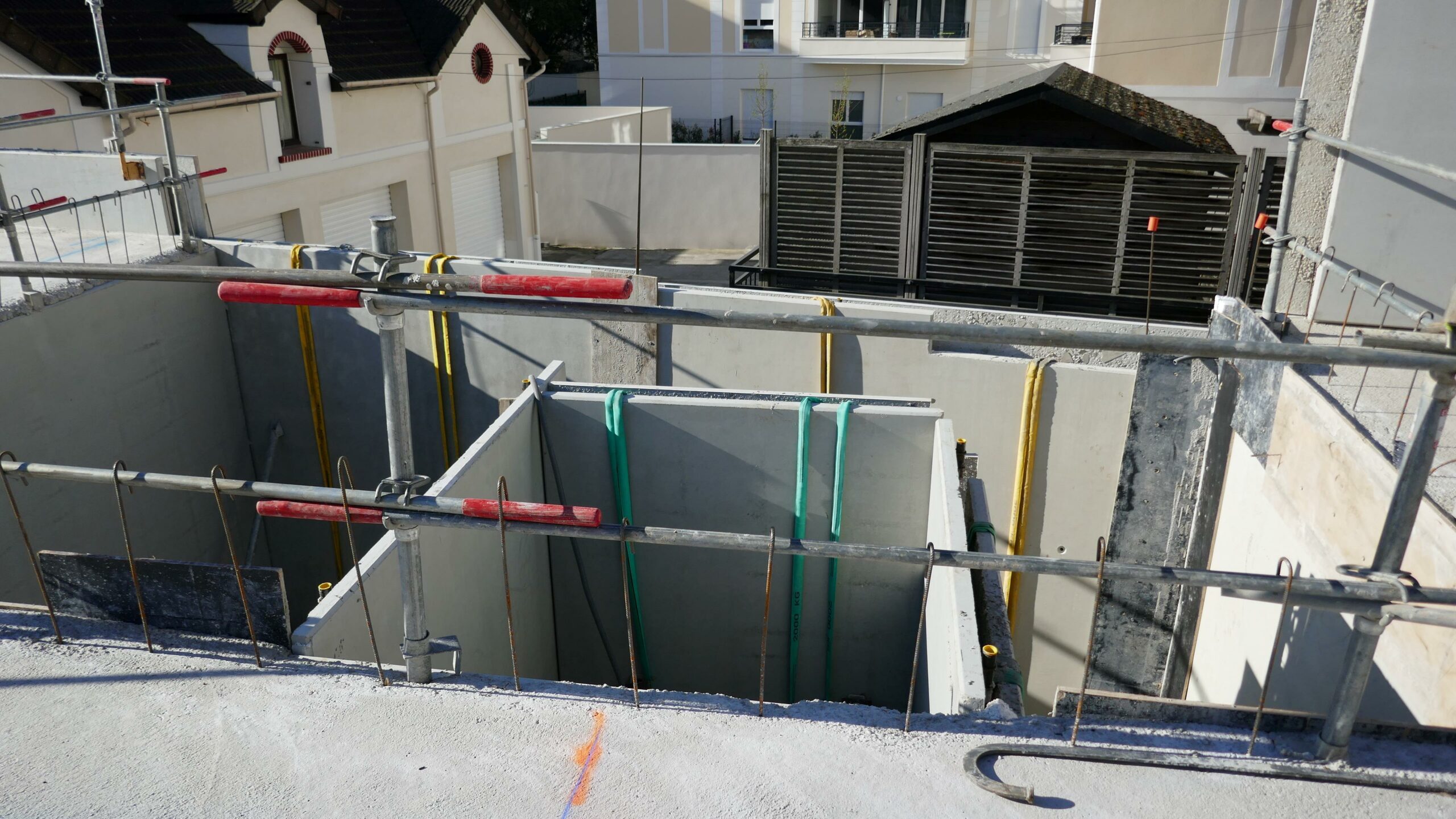 Les parois du sous-sol, destiné à accueillir un échangeur avec le chauffage urbain, vingt places de parking, dix caves et des locaux techniques, ne peuvent donc pas encore être achevées. Des tuyaux d’évacuation y sont positionnés à intervalles réguliers.