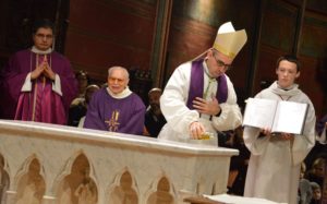 Monseigneur Mathieu Rougié oint l’autel avec le saint chrême.