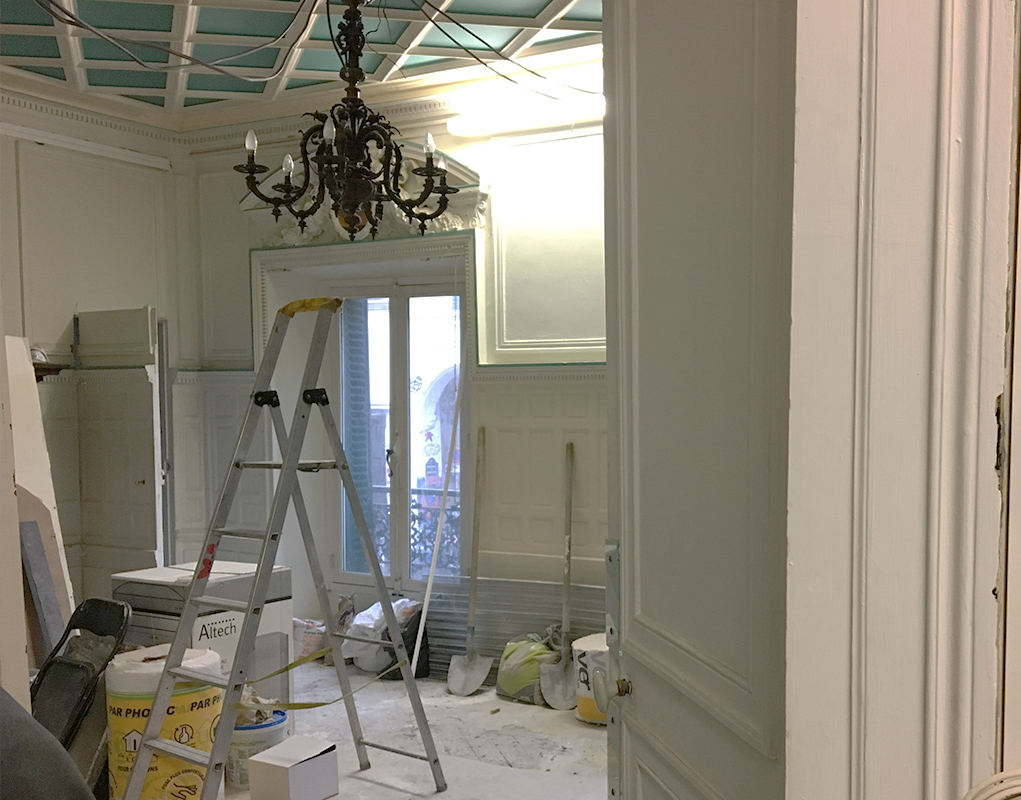 Les marches de l’escalier de bois sont recouvertes d’un film plastique et une petite poussière fine colle aux semelles. Que l’on monte au dernier étage ou descende au rez-de-jardin, partout des signes des travaux en cours. Depuis plus de 6 mois les habitants du presbytère de l’église Saint-Jean-de-Montmartre à Paris (18e arrondissement) vivent dans le chantier de rénovation du bâtiment.