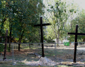 Sur le site du sanctuaire, trois croix de bois rappellent le miracle des trois marchands sauvés par un ange envoyés par la Vierge en 1212 dans la forêt de Bondy.