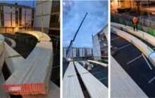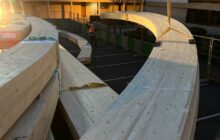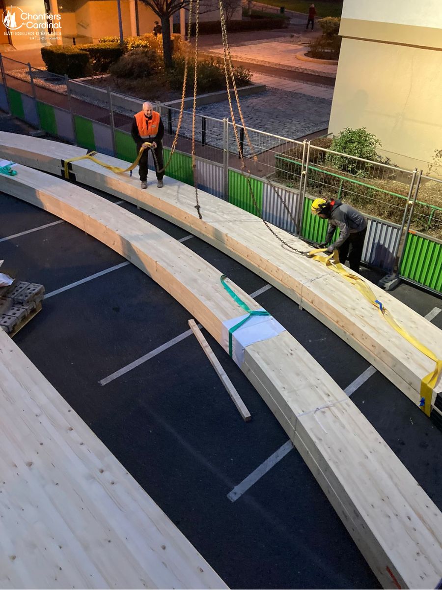 La toiture existante a fait l’objet d’un relevé altimétrique initial précis en 3D. Les pannes ont été fabriquées en usine avec une courbure épousant parfaitement celle de la toiture, là où elles devront être installées. Elles ont été ainsi soigneusement répertoriées et viendront prendre appui sur la poutre faitière, grâce à des ferrures métalliques.
