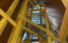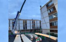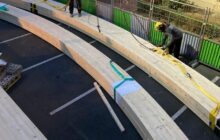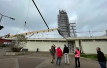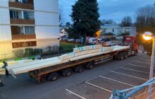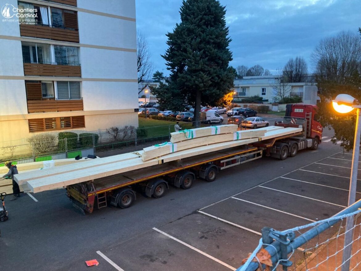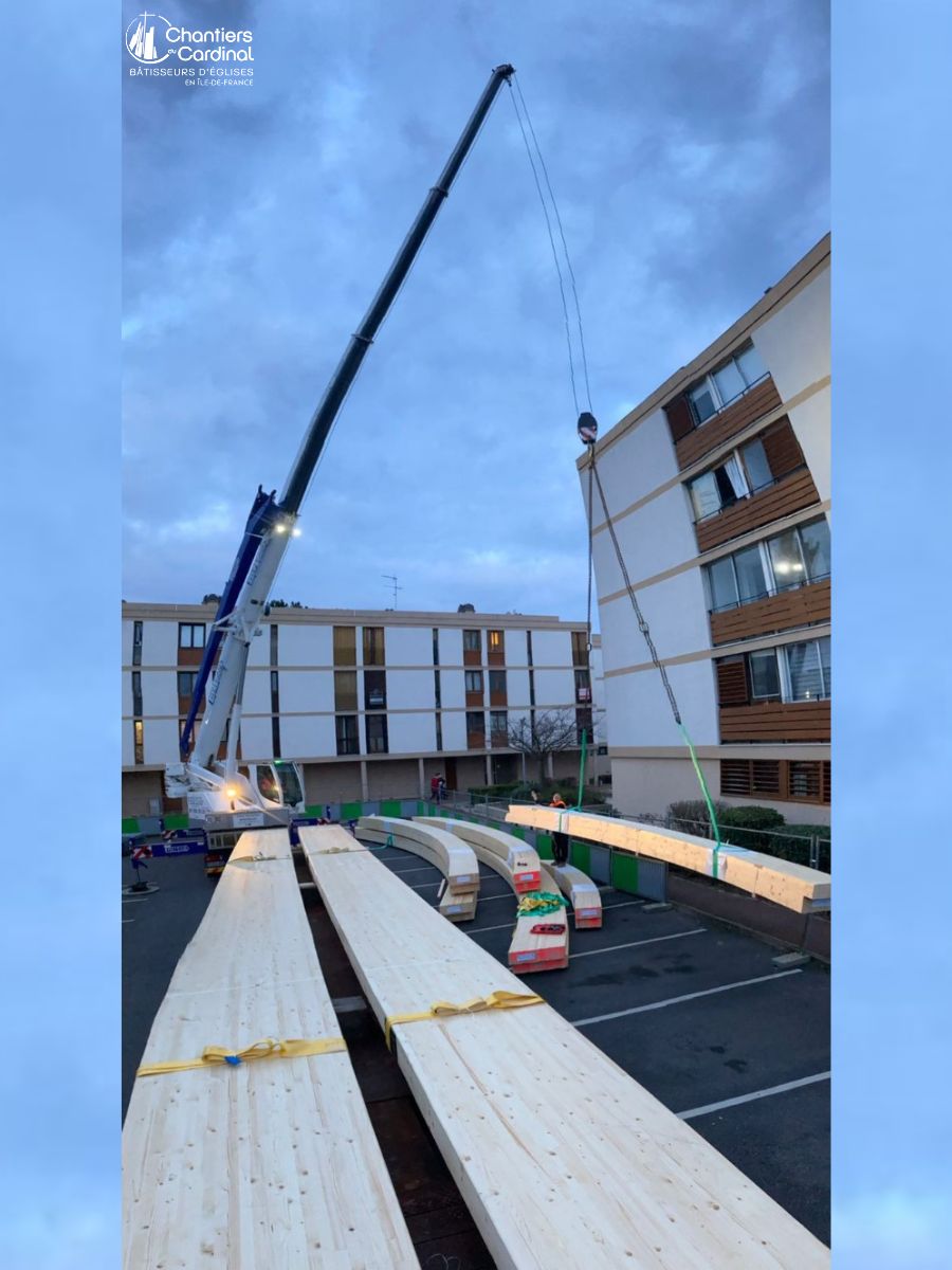 Tous les éléments de charpente qui ont été fabriqués sur mesure en bois lamellé-collé ont été livrés de nuit sur le parking de l’église, avec un enlèvement spectaculaire par grue.