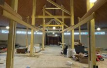 Ce portique permettra par ailleurs la création d’un narthex, en constituant son ossature de support. La poutre faitière a été mise en place par gruttage. Sa grande longueur a nécessité une fabrication en deux tronçons qui ont été raboutés en place, au droit du portique d’appui.