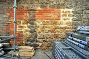 Le chantier de restauration est réalisé sous le contrôle d’un architecte des Monuments historiques. Ici les essais de nettoyage de la pierre meulière des façades extérieures. (Crédit CDC/GF)