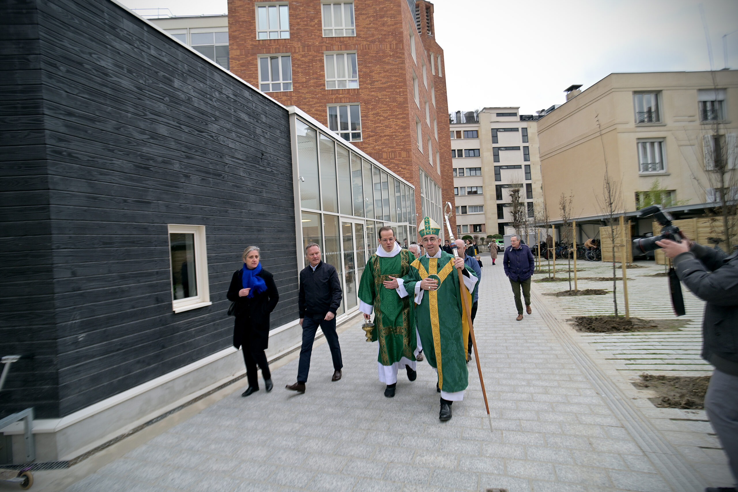 Sur le parvis, bénédiction des locaux de la paroisse Ste-Cécile à Boulogne (92) Janvier 2023. Mgr Rougé est accompagné d’Alice Fabre et Jean-Pierre Gaspard, des Chantiers du Cardinal. GF/CDC
