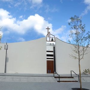 Épinay-sous-Sénart : vue de la façade repeinte et ornée d’une croix et d’une cloche. (Crédit paroisse)