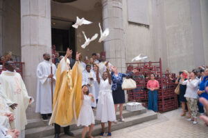 2023 06 11 – Sainte-Agnès 90 ans – sortie messe – lancer de colombes -2