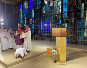 Le tabernacle, réalisé par l’artiste plasticienne Anne Bernot. Bénédiction du mobilier liturgique par Mgr Blanchet le 4 décembre 2022. Église Saint-Paul à Fresnes. (CDC)