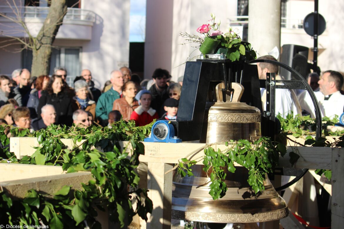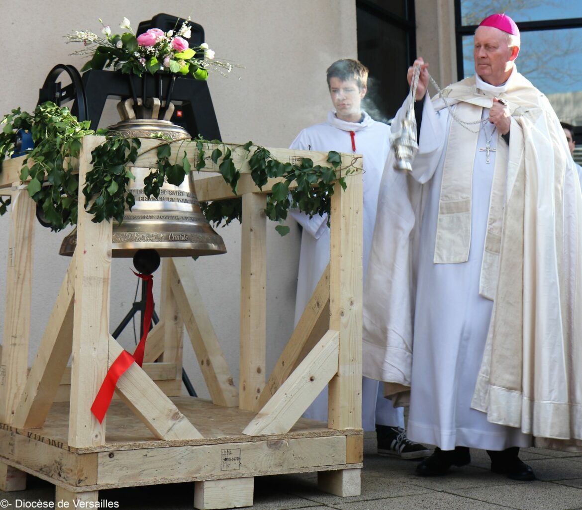 Après avoir appelé les parrains et marraines de chaque cloche, Mgr Crepy les bénit avant de faire de même pour les fidèles et les trois cloches. Trois petites filles lisent avec force les intentions de prière avant que l’évêque de Versailles procède à l’encensement des trois cloches. Les parrains et marraines peuvent alors sonner les cloches.