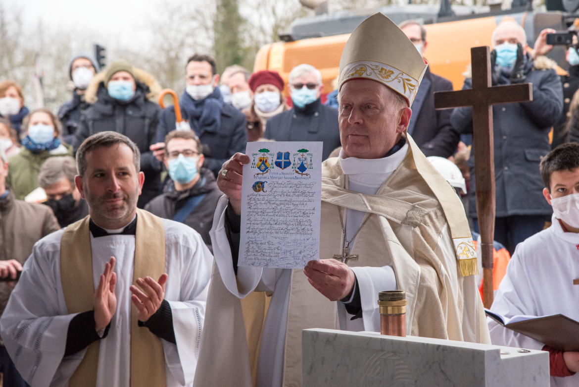 Mgr Luc Crepy et P. Pierre-Hervé Grosjean entourés des Parrains et Marraines des cloches de la future église