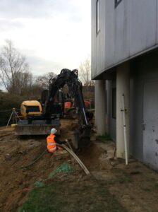 Travaux de terrassement pour l’agrandissement des locaux paroissiaux autour de l’église ND du Val à Bussy-Saint-Georges (77). Janvier 2023. (SG/CDC)
