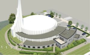 Vue 3D des locaux paroissiaux agrandis et aménagés autour de l’église Notre-Dame du Val à Bussy-Saint-Georges (77). Janvier 2023. (SG/CDC)