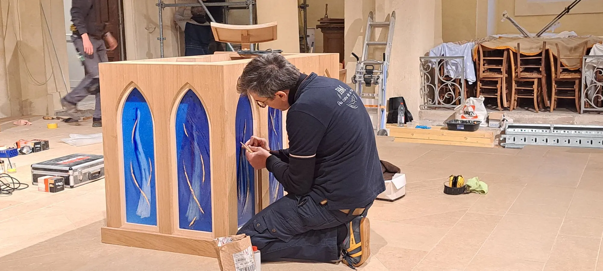Bruno de Maistre travaillant sur le nouvel autel de l’église Saint-Pierre Saint-Paul de Montreuil