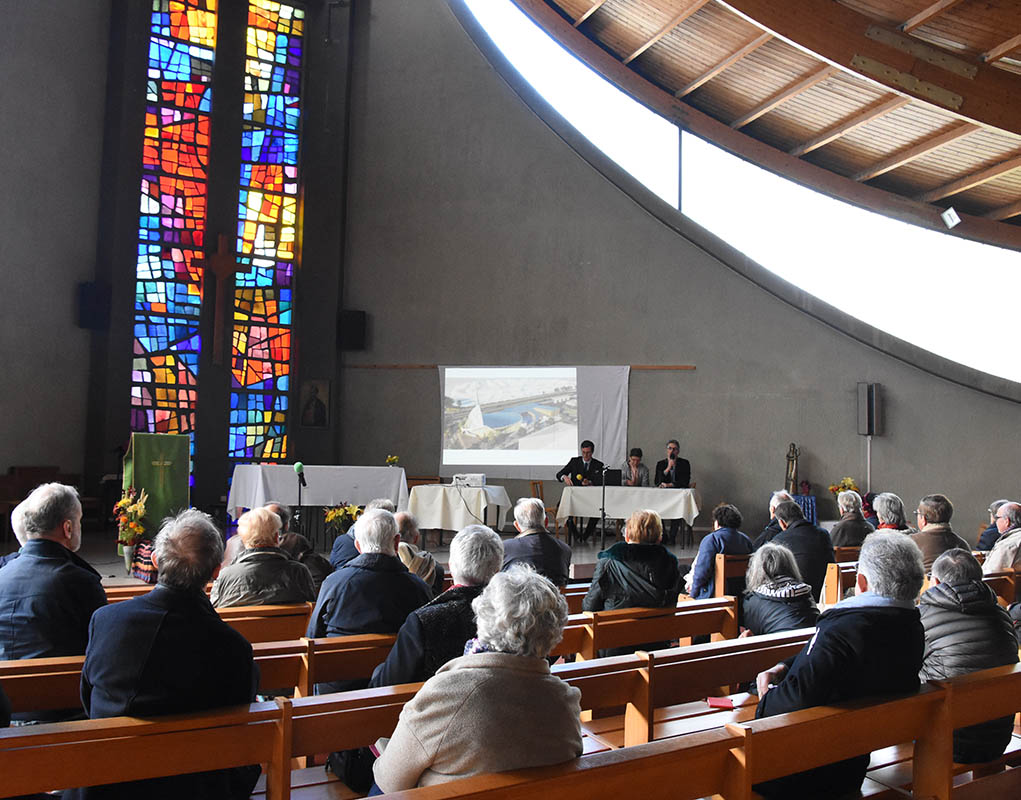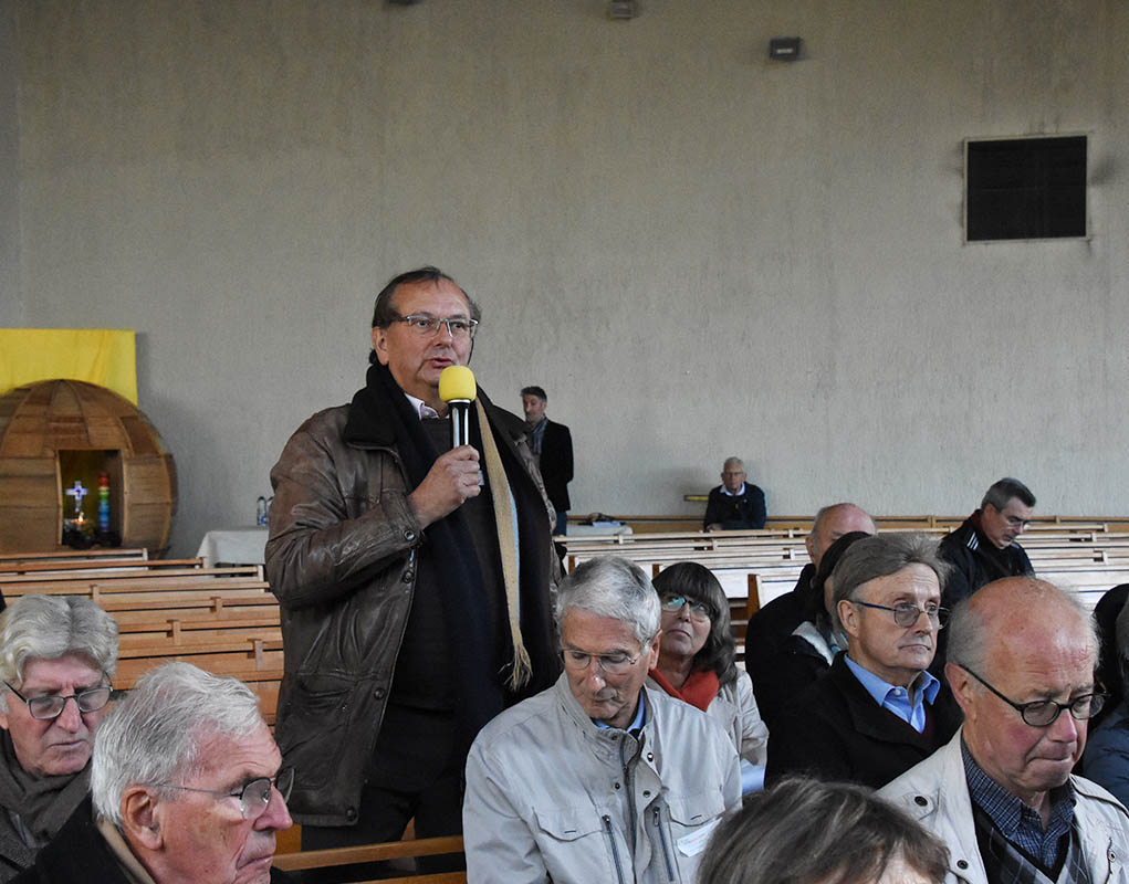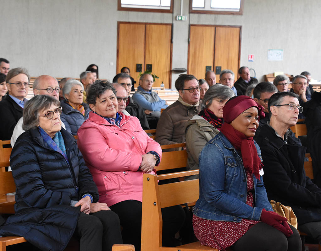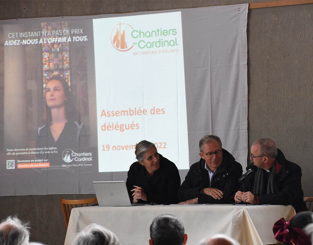 L’église Saint-Paul, dont la construction a été achevée en 1967, a été consacrée en 1969, rappelle, dans son mot de bienvenue, le père Vincent Scheffels, curé de la paroisse de Nanterre (92). Sous son vaste toit courbé, la grande nef sans pilier accueille les délégués des Chantiers du Cardinal. Les vitraux derrière l’autel apportent une grande luminosité à cette église qui a bénéficié d’un financement des Chantiers du Cardinal entre 2020 et 2021 pour réhabiliter les locaux paroissiaux. Quelques années auparavant, des travaux importants sur la toiture et pour assurer l’étanchéité extérieure avaient également été réalisés.