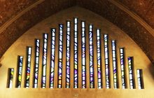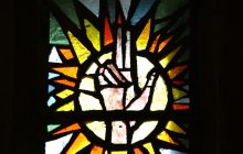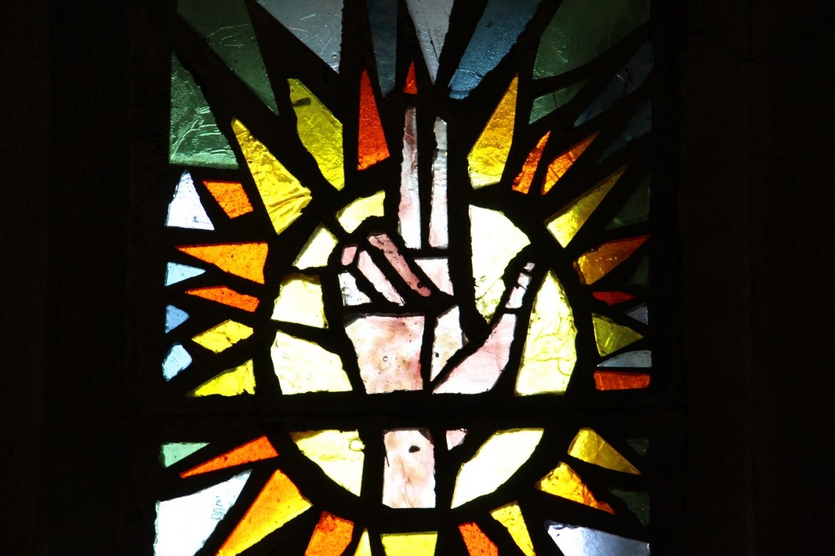 Détail d’un vitrail sur un bas côté de l’église. (DM/CDC)