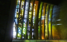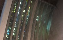 C’est l’une des seules sources de lumière naturelle dans le chœur de l’église. Mais pour le moment, le vitrail installé sur le toit de Saint-Michel de Goussainville (95) est recouvert d’une bâche et ne laisse pas passer le soleil. C’est plutôt l’eau du ciel qui tombe. « Il pleut sur les servants d’autel ! » raconte l’abbé Jean-Baptiste Armnius, le curé de cette paroisse du diocèse de Pontoise. Le vitrail réalisé avec la technique de la dalle de verre (le verre est inséré dans une résille de ciment) est mal en point. Des morceaux sont déjà tombés dans l’église. Depuis, un filet de protection a été installé à l’intérieur. Dehors, sur le toit en ardoises, une bâche masque depuis plusieurs années ce vitrail coloré. Aujourd’hui, il devient urgent pour la paroisse de faire procéder à sa restauration. La plaque de protection en verre transparent, posée quelques années après son installation, ne remplit plus son office. L’eau coule partout, dégradant non seulement le vitrail mais aussi la toiture.