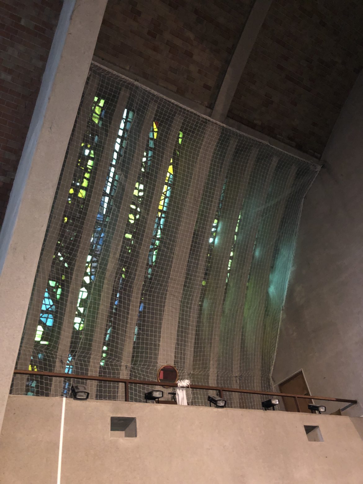 Vue intérieure du vitrail. Un filet de protection empêche la chute des éléments à l’intérieur de l’église. (CDC)