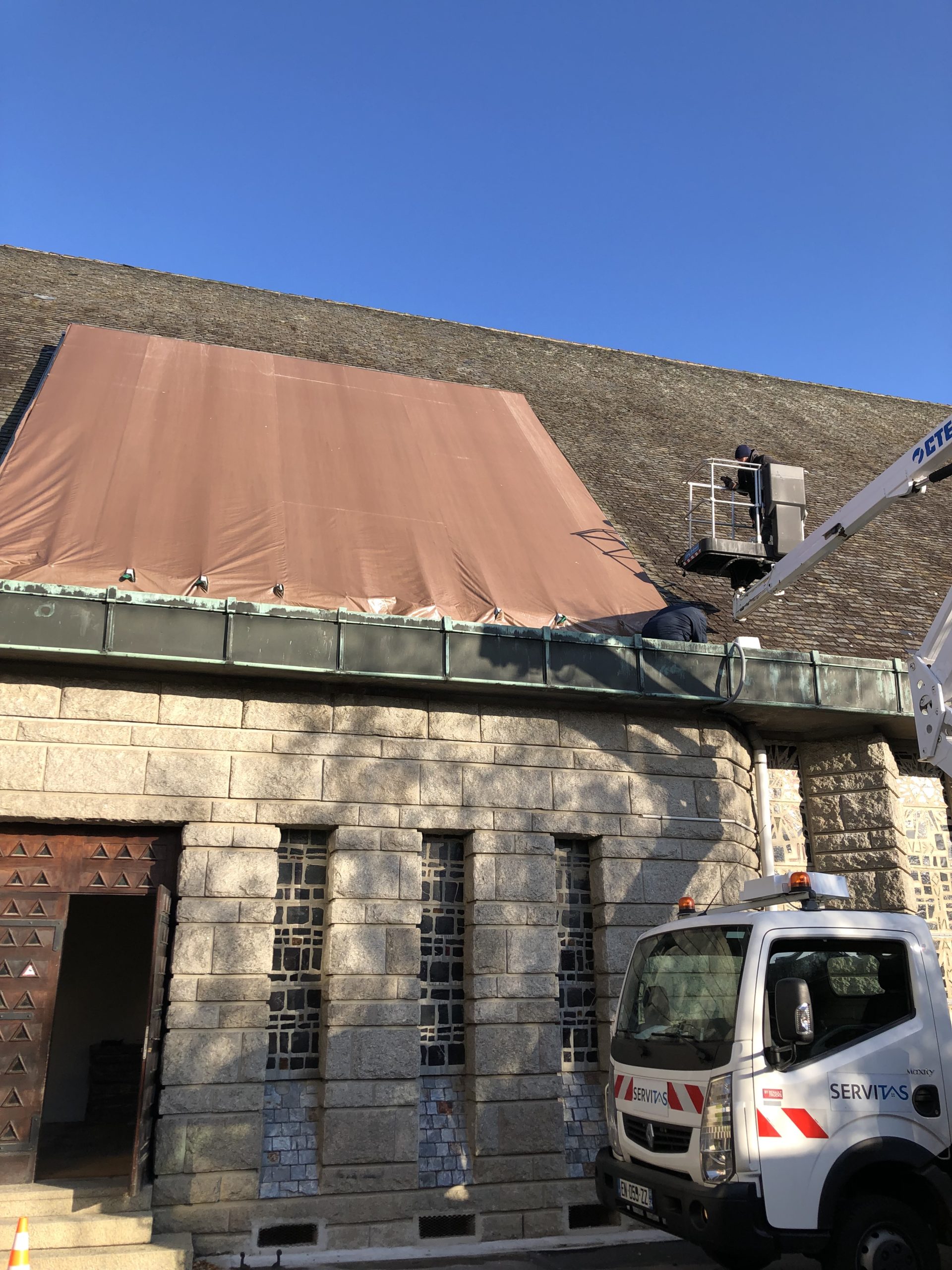 Le vitrail sur le toit de l’église, protégé par une bâche avant l’intervention des Ateliers Loire. (CDC)