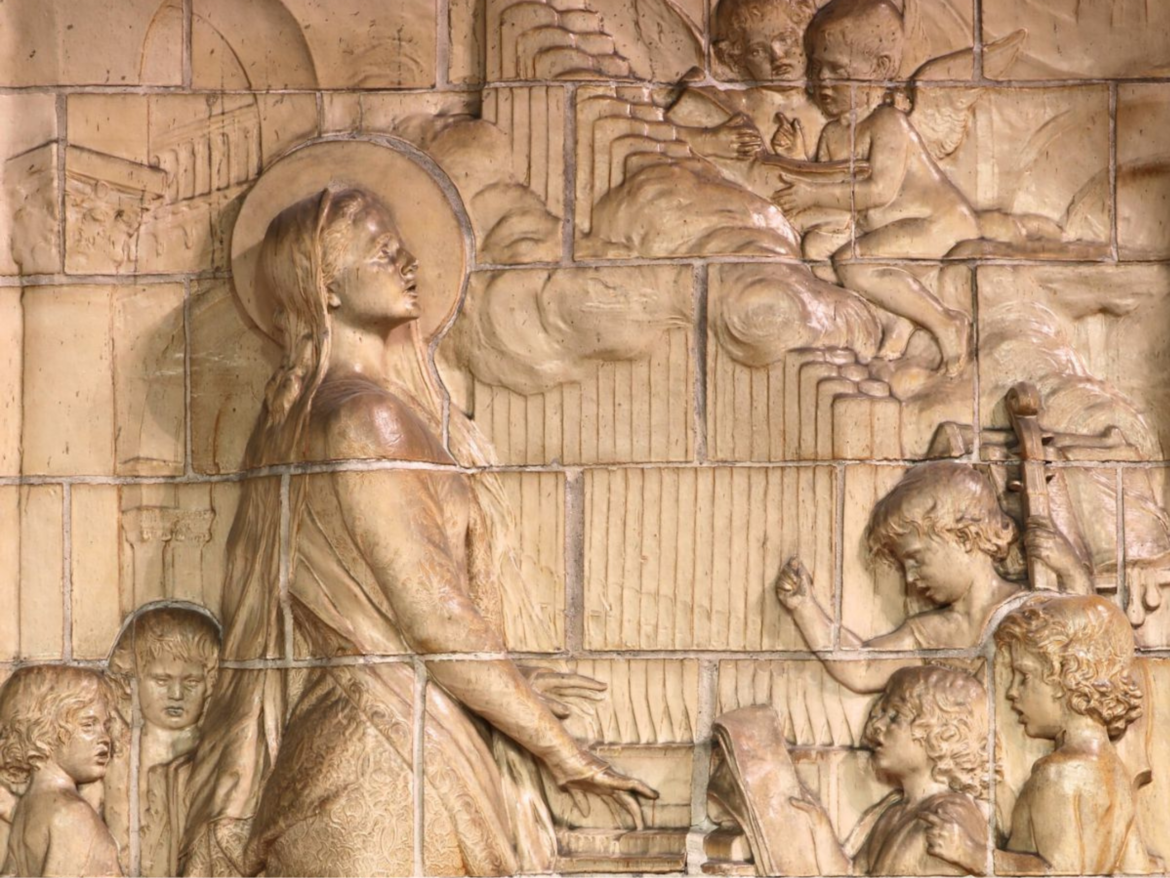C’est une œuvre du sculpteur Charles Desvergne qui, en 1891, a réalisé un plâtre intitulé « Musique sacrée » pour le Grand Prix de Rome qu’il obtient cette année-là. Les usines Muller d’Ivry-sur-Seine (92) en tirent une copie en briques de grès flammé (les moules de cette usine ont été détruits pendant un bombardement lors de la Première Guerre mondiale). Quel est donc ce matériau très utilisé dans l’art nouveau, notamment par Guimard pour ses entrées du métro parisien ? C’est une argile cuite à très haute température (1 200 °C), qui prend à la cuisson une couleur assez foncée, entre gris et marron. Que voit-on dans cette céramique ? Une scène musicale dédiée au pape Pie X, rénovateur de la musique sacrée, au peuple du petit Charonne, quartier du XXe arrondissement de Paris. La sainte patronne des musiciens, en pied, vêtue d’une robe richement décorée, caresse de ses doigts délicats le clavier d’un orgue portatif. Autour d’elle, un chœur d’enfants et d’angelots aux fins cheveux bouclés lui présentent des partitions.