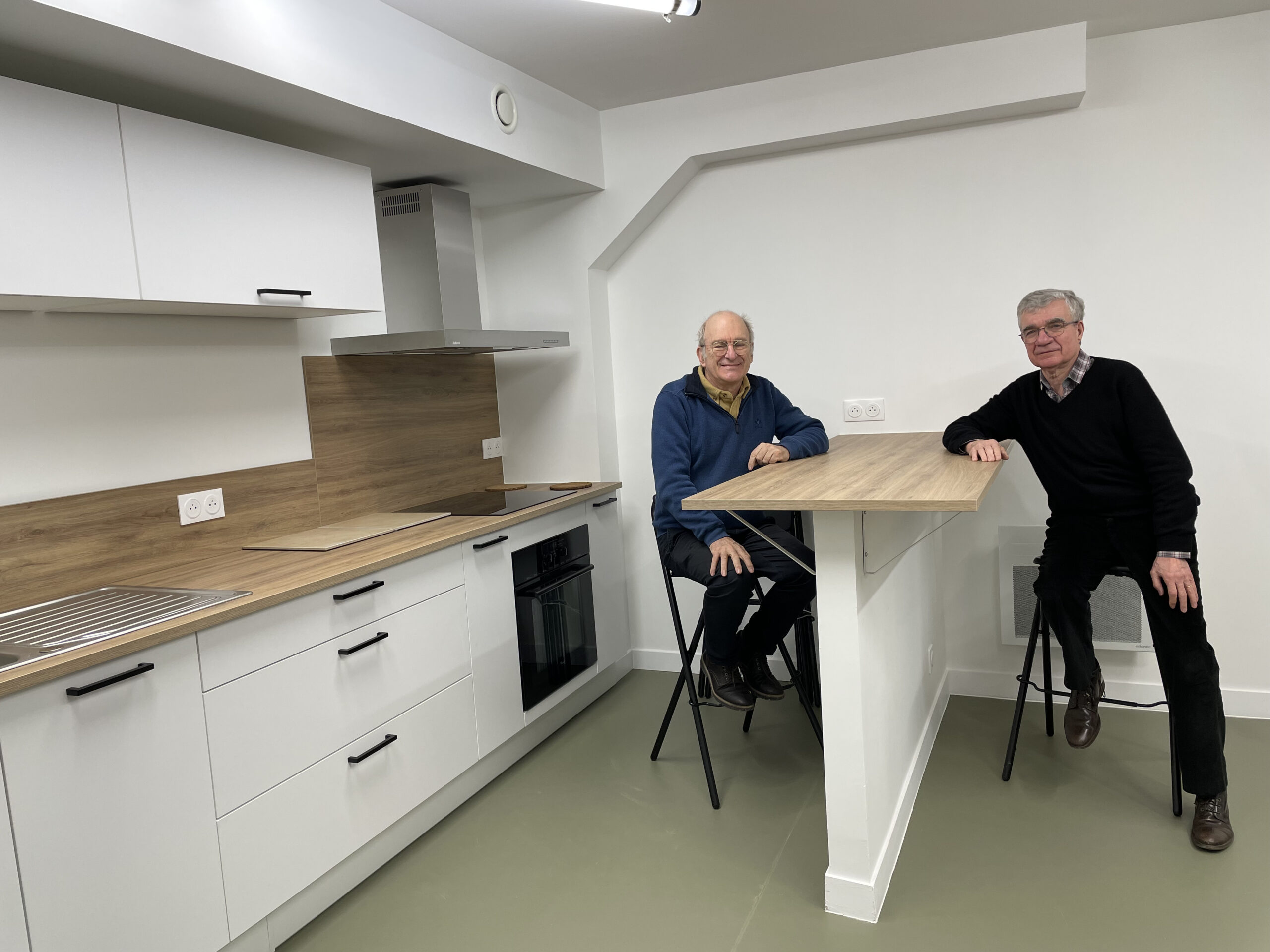 Le p Jacques Cramet, curé de la paroisse St Christophe de Créteil et Eric Seillier, chargé du suivi des travaux, dans la cuisine des locaux agrandis. janvier 2023 (RDV/CDC)