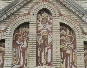 Au dessus du porche, saint Léon accueille les fidèles. Crédit R Pothier.