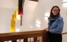Anne-Claire Garbe, conservatrice de la Cité du vitrail devant le lustre monumental constitué de 24 manchons de verre. Photo Arielle de Sainte Marie