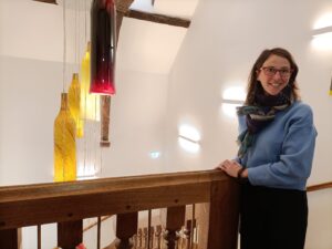 Anne-Claire Garbe, conservatrice de la Cité du vitrail devant le lustre monumental constitué de 24 manchons de verre. Photo Arielle de Sainte Marie