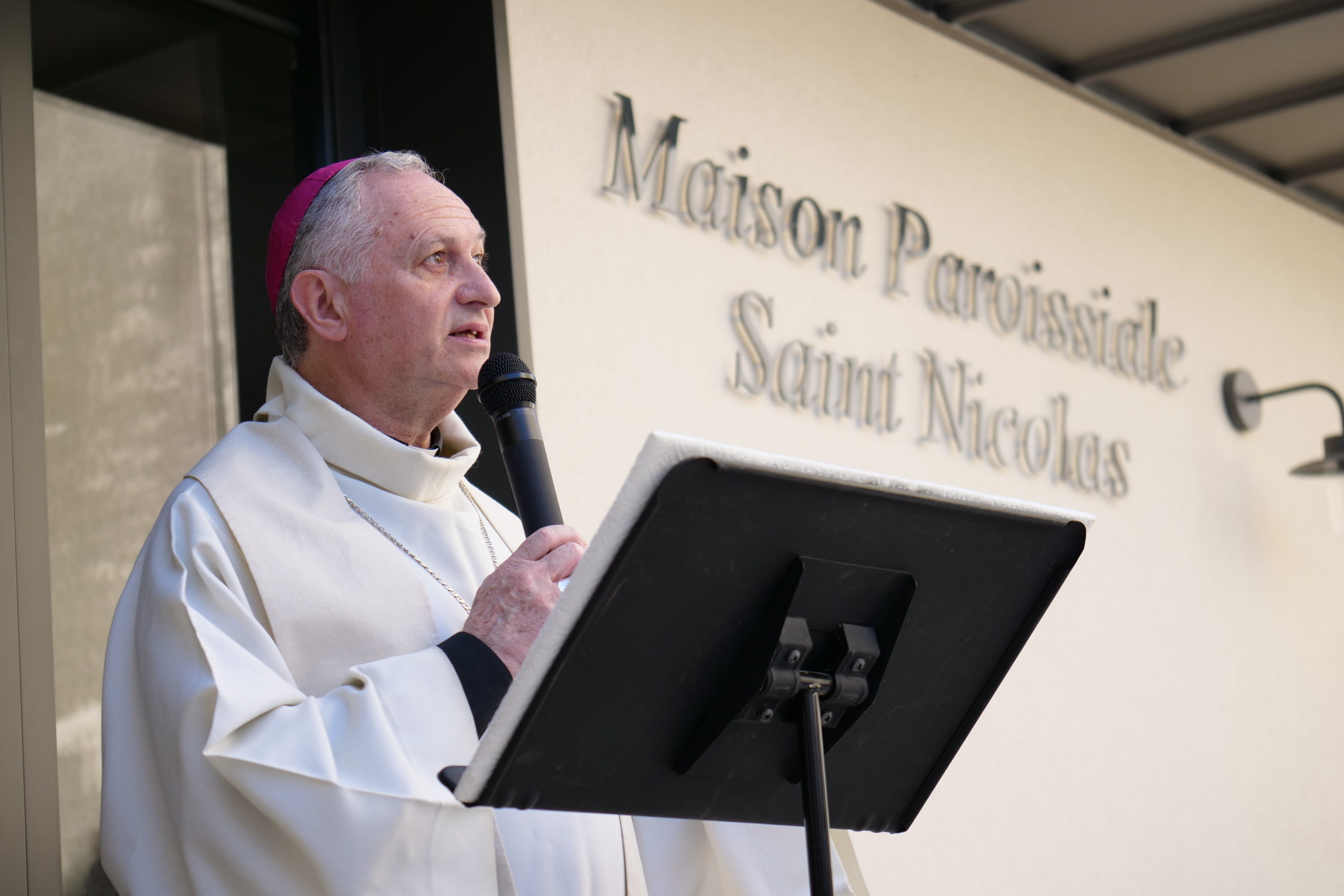 Mgr Nahmias, évêque du diocèse de Meaux inaugure la maison paroissiale Saint-Nicolas au centre-ville de Meaux, en mars 2022. (crédit paroisse)