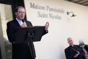 Le père Thierry Leroy, curé de la paroisse de Meaux-centre, lors de l’inauguration de la maison Saint-Nicolas à Meaux en mars 2022. (Crédit paroisse)