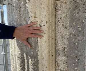 Différences de teintes de béton sur une colonne du clocher de ND du Raincy. (CDC)