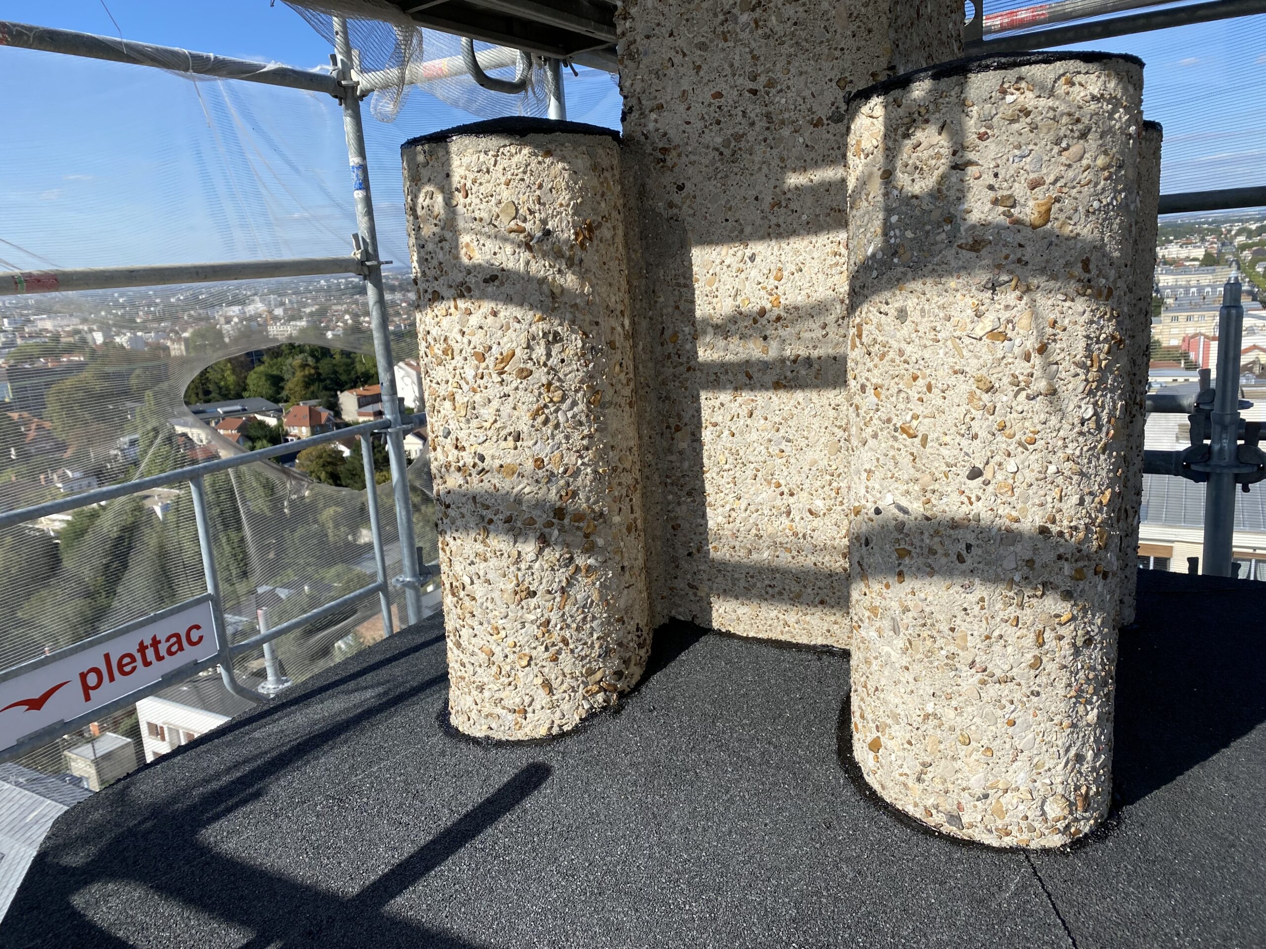 Pose d’un revêtement étanche sur le sommet des colonnes du clocher de ND du Raincy en septembre 2022. (CDC)