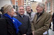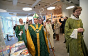 A Boulogne, Mgr Rougé salue Alice Fabre et Jean-Pierre Gaspard, des Chantiers du Cardinal. Bénédiction des locaux paroissiaux Sainte-Cécile. Janvier 2023. (GF/CDC)