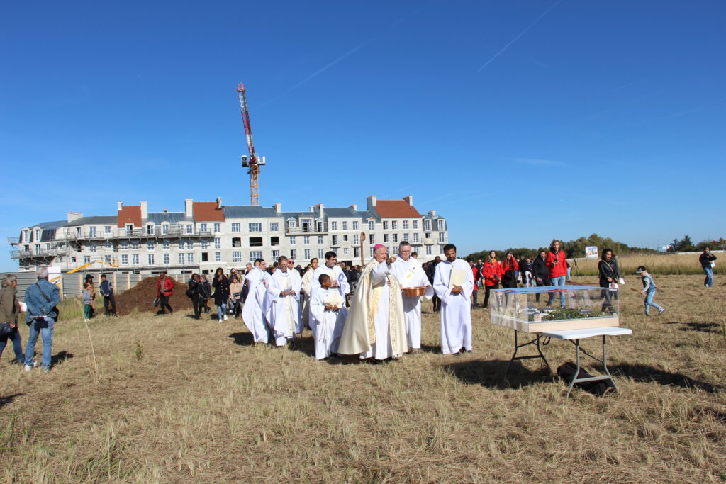 Mgr Jean-Yves Nahmias, évêque de Meaux bénit la maquette du futur centre paroissial Saint-Colomban (77) le 16 octobre 2022. (CDC)