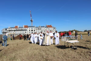 Mgr Jean-Yves Nahmias, évêque de Meaux bénit la maquette du futur centre paroissial Saint-Colomban (77) le 16 octobre 2022.
