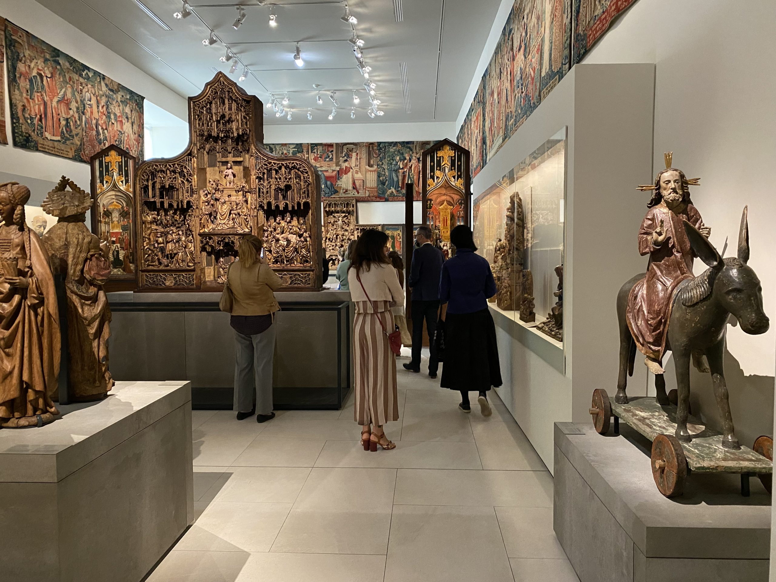 Expositions de retables dans la dernière salle du parcours. À droite, le Christ des Rameaux, sculpture sur roulettes portée en procession. (CDC)