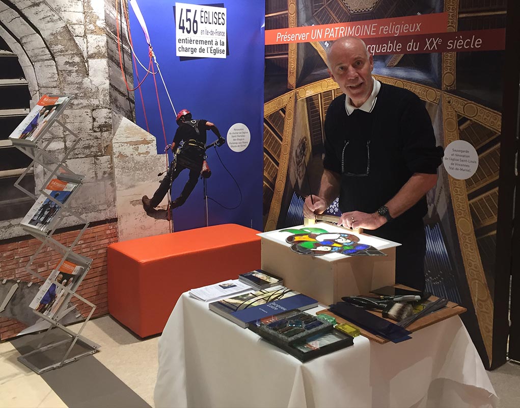 Pendant la durée du Salon du Patrimoine, le maître-verrier Hervé Loire a proposé aux visiteurs une démonstration de son savoir faire. Vitrail en plomb ou dalle de verre, les techniques de restauration ne sont pas les mêmes. Le maître-verrier a le souci de travailler sans dénaturer le vitrail d’origine.