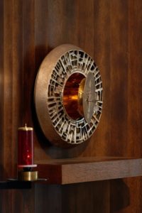 La porte du tabernacle de l’église Saint-Paul de Brétigny, en forme de réacteur d’avion. (Crédit paroisse)