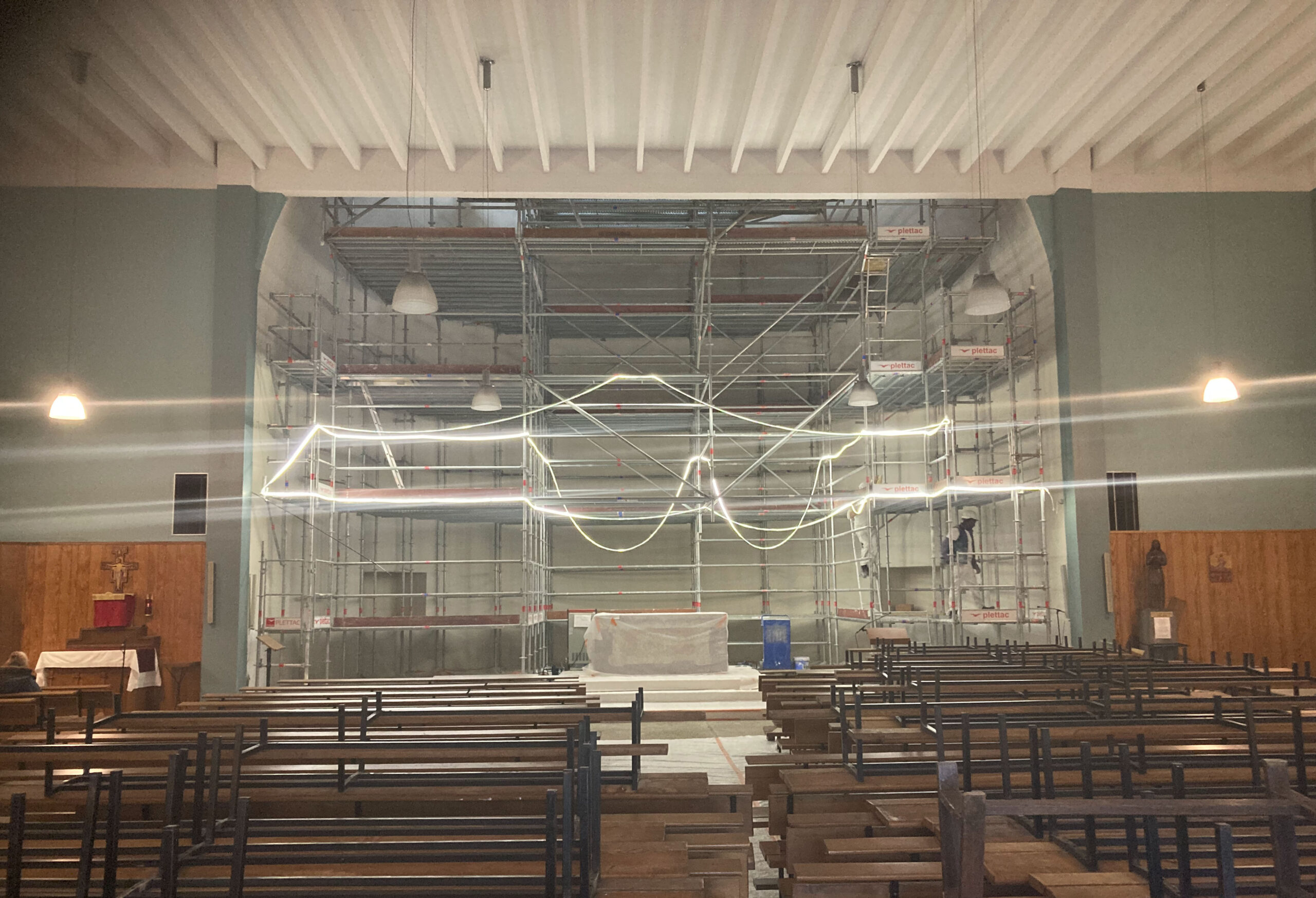 Une teinte bleu-vert a été retenue pour les murs à l’intérieur de l’église Sainte-Claire d’Assise à Paris (Crédit paroisse)