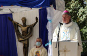 Si le bois manque sur certains chantiers, celui-ci n’aura pas à souffrir de la pénurie de matériaux assure l’architecte. « Tout a été commandé à temps » précise Philippe Roux lors d’une visite de chantier en juillet 2021. Il se réjouit de pouvoir montrer la structure de la future église aux participants du pèlerinage diocésain, en septembre prochain. «On aura du volume à montrer» explique-t-il, lui qui jusque là faisait tracer l’emplacement de l’église sur la pelouse. « C’était balisé comme un terrain de foot » glisse l’homme de l’art avec un sourire. Il désigne l’espace dévolu au lieu de culte : un chœur éclairé par un vaste pignon vitré. L’assemblée aura sous les yeux le dôme de la chapelle Notre-Dame-des-Anges, toute proche. Les trois croix de bois, souvenir du miracle du XIIIe siècle à l’origine du sanctuaire (trois marchands ligotés par des brigands avaient été libérés par la Vierge) seront mises en valeur pour faire le lien entre les deux bâtiments.