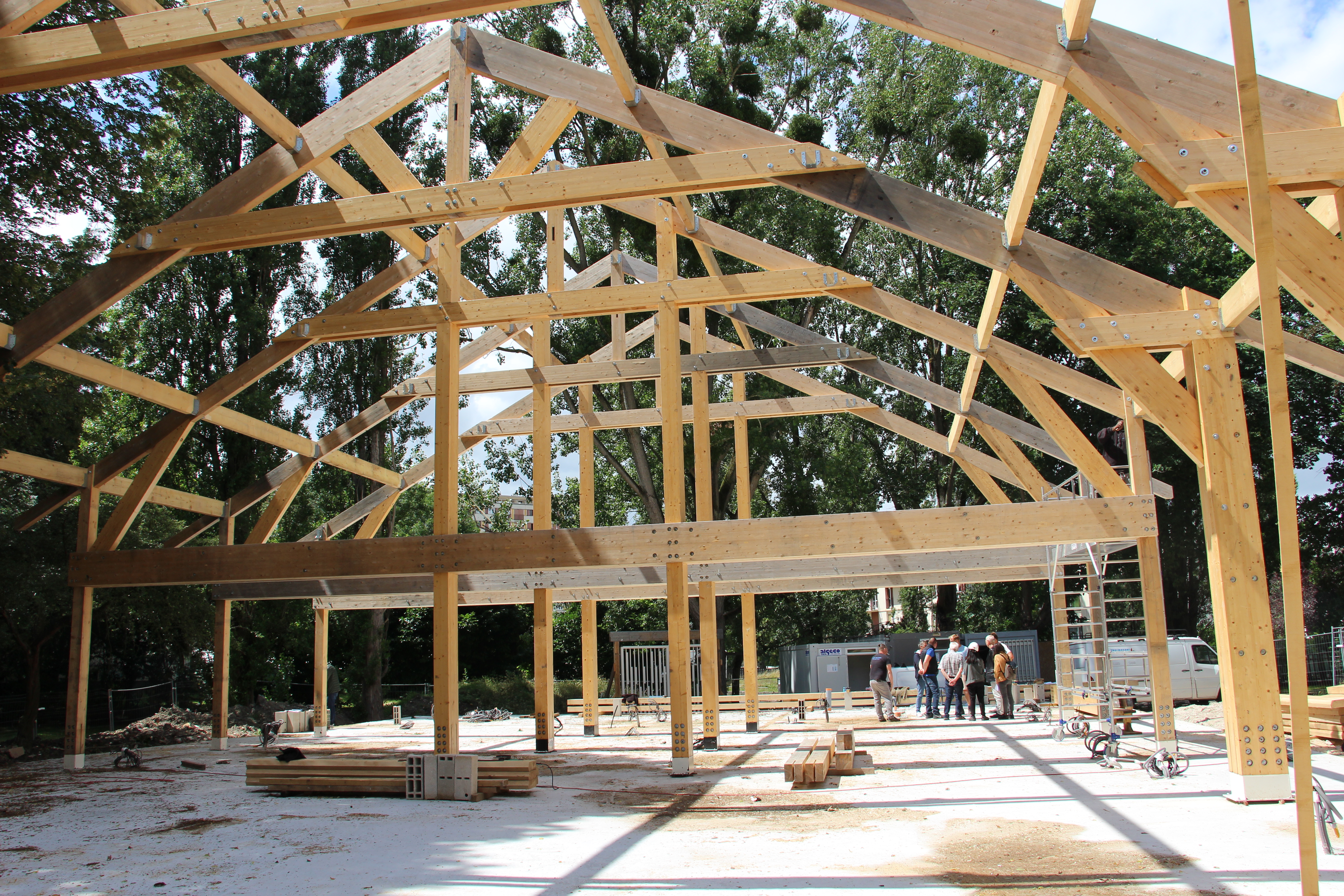 En juillet 2021 les charpentiers montent la structure en bois de l’église Saint-Jean-XXXIII à Clichy-sous-Bois. Elle est posée sur une dalle de béton. (Crédit CDC)