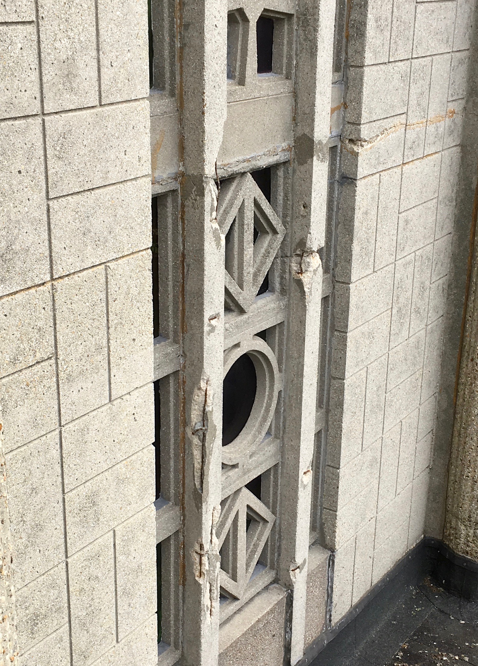 Sous l’effet de la pollution et des intempéries les fers font éclater le béton de Notre-Dame du Raincy (Crédit paroisse)