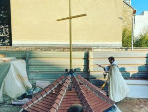 Le père Barthélemy, curé de la paroisse, bénit la croix qui sera installée sur le toit du bâtiment de Sainte-Cécile à Boulogne-Billancourt en mars 2022. (Crédit Paroisse)