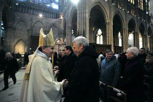 14 janvier 2018, Jacques Moulin, architecte en chef des Monuments historiques, avec Mgr Pascal Delannoy lors de la consécration du nouvel autel de la basilique cathédrale de Saint-Denis.