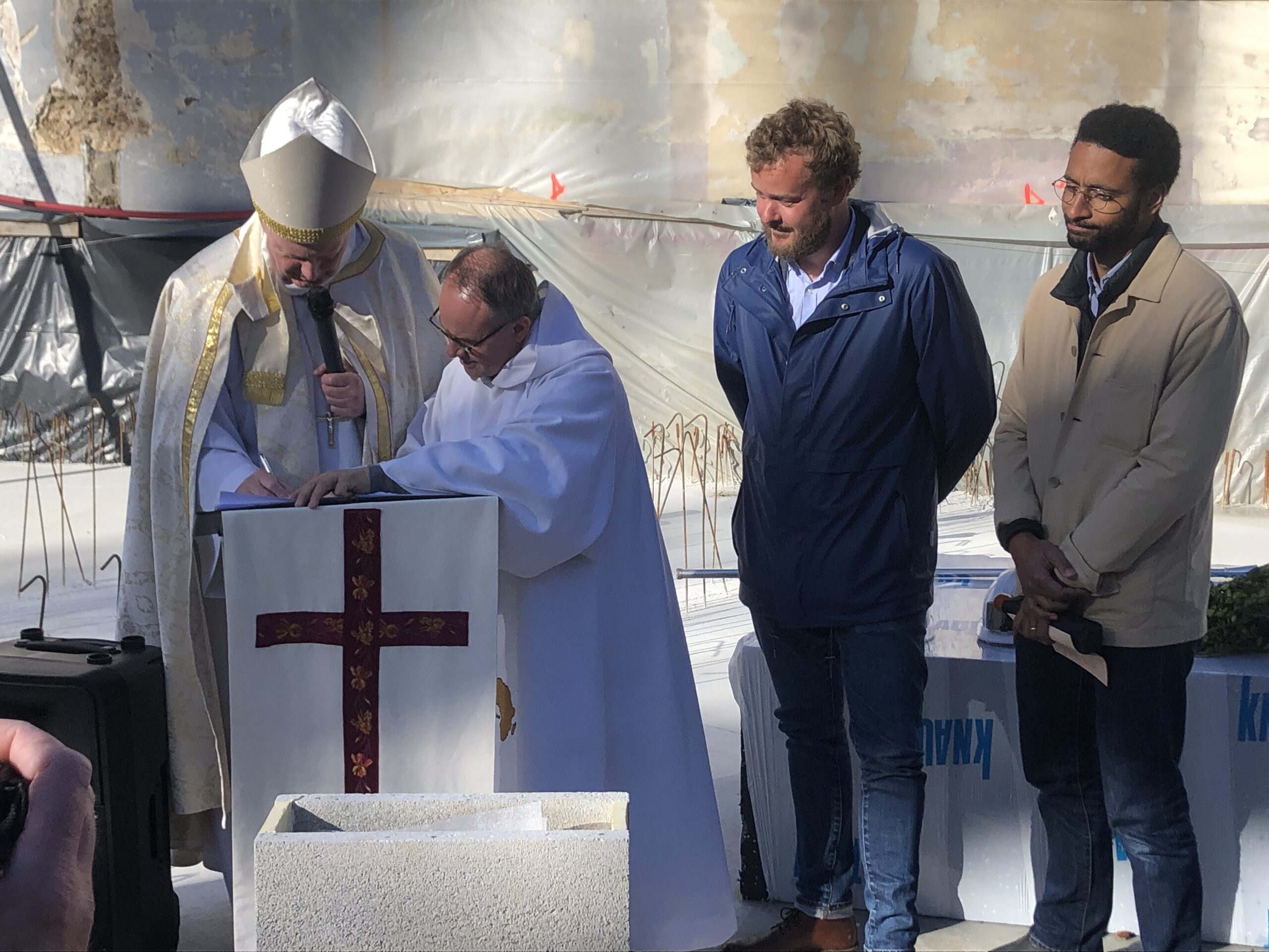 Mgr Luc Crepy et Père Yann Le Lay en compagnie des architectes Pierrick Fromentin et Jonathan Toguyeni, lors de la signature du parchemin actant la construction.