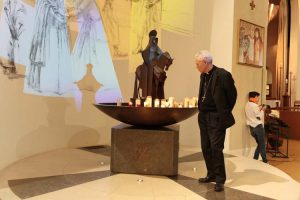 Mgr Eric Aumonier, évêque accompagnateur des Chantiers du Cardinal devant une des deux vasques monumentales.