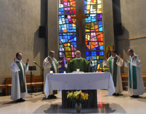 Autour de Mgr Verny (de g. à d.) les pères Pelletier, Scheffels, Bonnassies et Louvet. Assemblée des délégués novembre 2022.